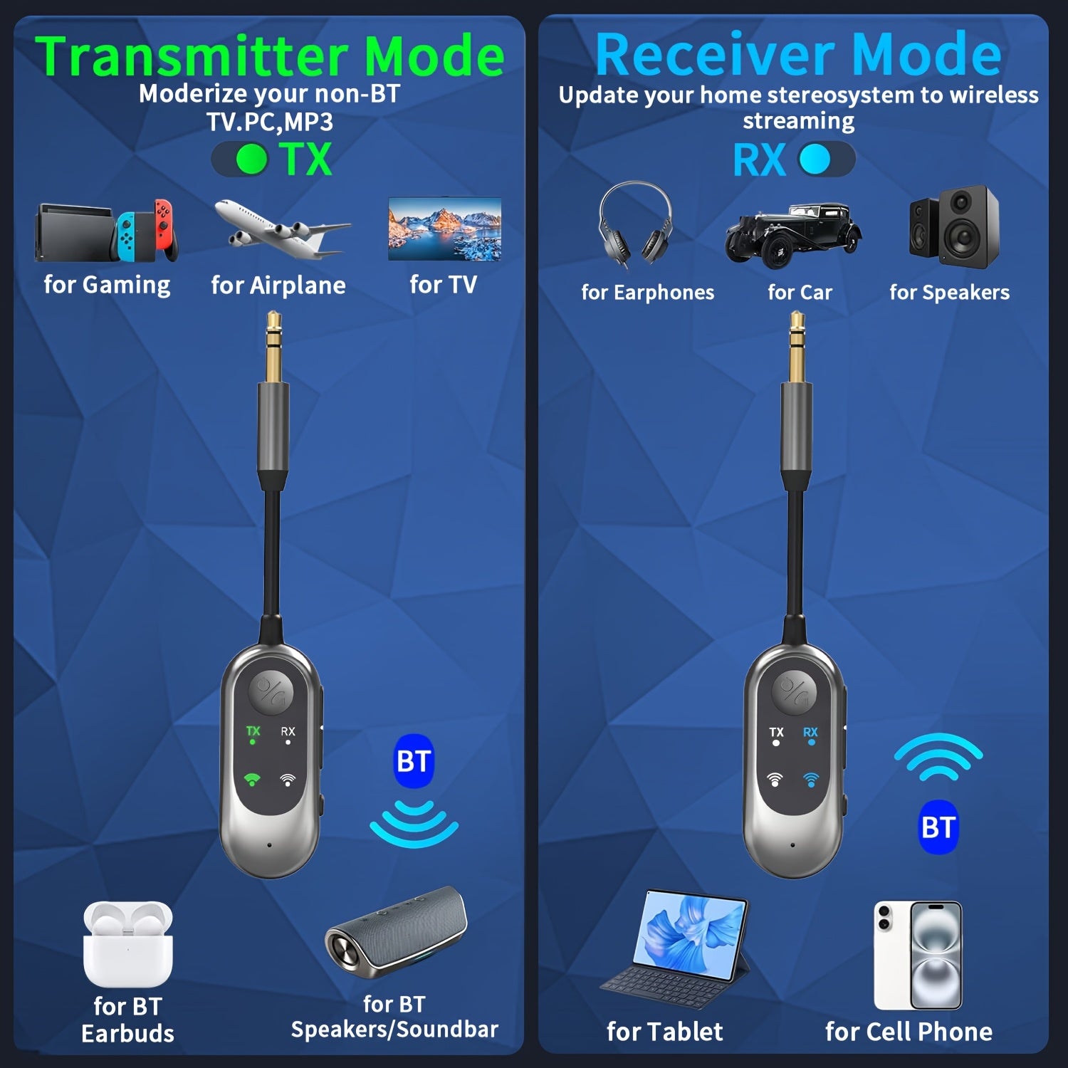 W samochodzie: Streamuj muzykę ze smartfona do starego radia samochodowego bez AUX W domu: Podłącz bezprzewodowe słuchawki do telewizora lub komputera W podróży: Używaj swoich ulubionych słuchawek Bluetooth z systemem rozrywki w samolocie